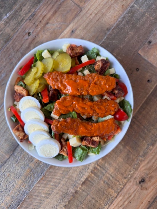 Chopped romaine, chopped iceberg, buffalo chicken, shredded carrots, celery, chives, jalapeno jack, tortilla chips, and garden ranch.